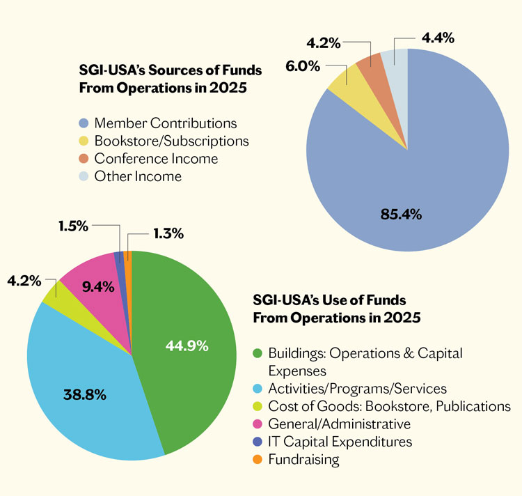 In 2025, the contributions from our members accounted for over 85.4% of the SGI-USA’s annual operating budget. This remarkable contribution highlights the importance of the May Contribution activity as a fundamental aspect of our efforts to build a peace movement anchored in the principle of respect for the dignity of life. Your generosity not only strengthens our visibility in our communities but also enables us to continue providing better and improved support for our members in their Buddhist practice.